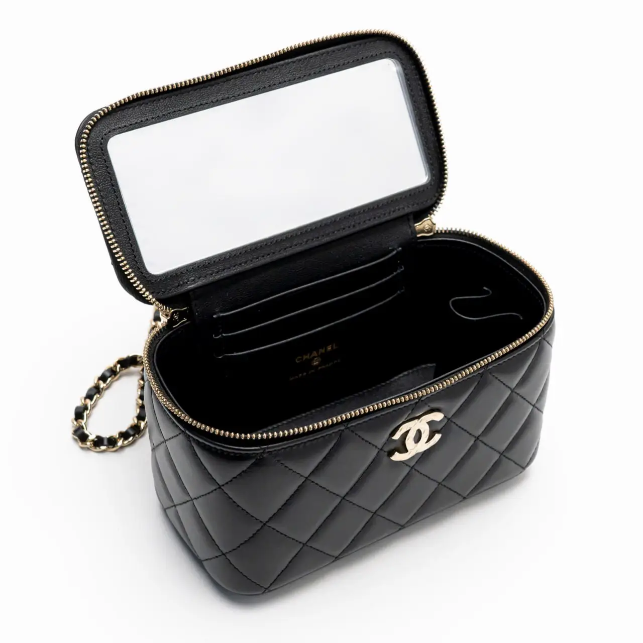 Chanel Gold Quilted Metal Black Lambskin Mini Vanity Bag LuxuryPromise Very well made.