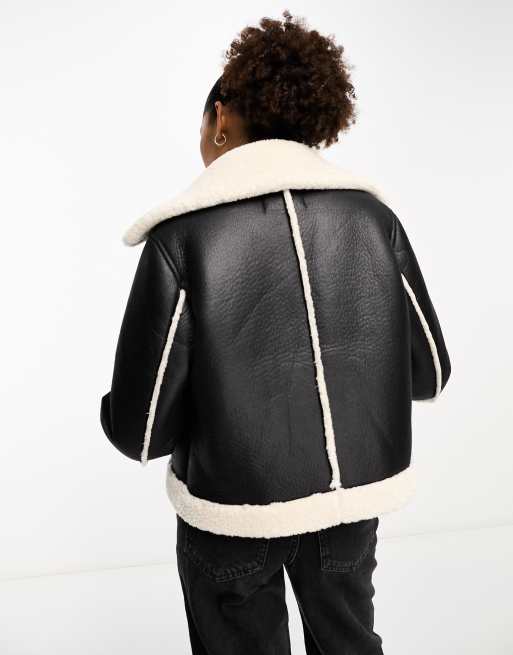 Stradivarius wrap aviator jacket with contrast borg in black Very well made.
