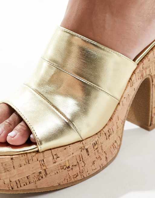South Beach cork heeled mules in gold Very well made.
