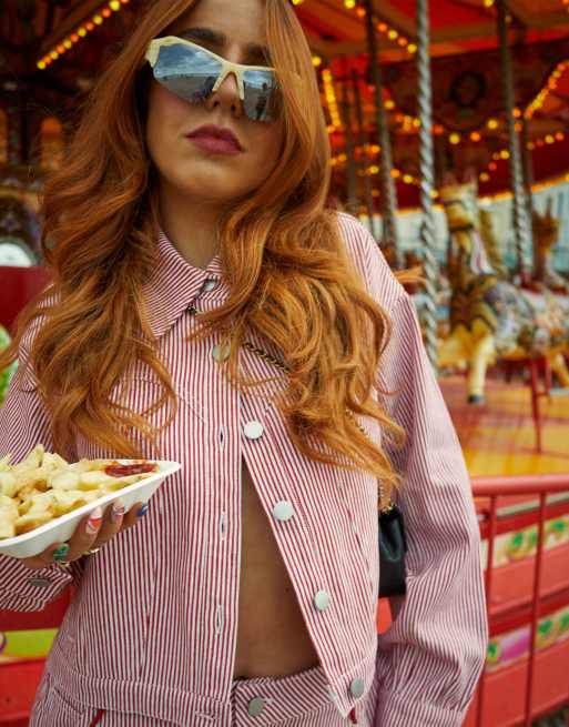 Labelrail x Laura Elizabeth Klein striped denim cropped denim jacket co ord in red ASOS Very well made.