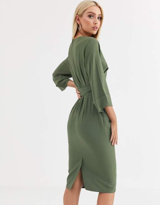ASOS DESIGN kimono sleeve v neck midi pencil dress in khaki Very well made.