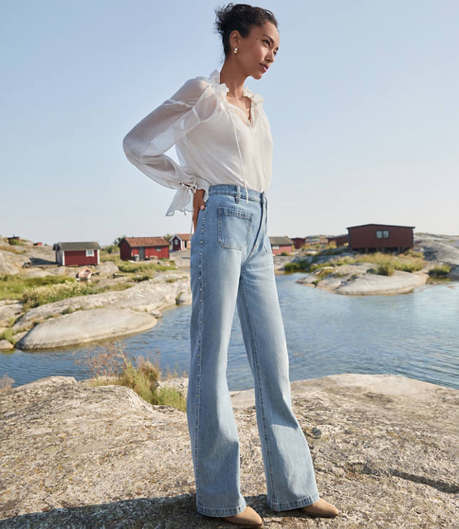 Side Studded Patch Pocket High Rise Relaxed Flare Jeans in Light Vintage Indigo Wash Very well made.