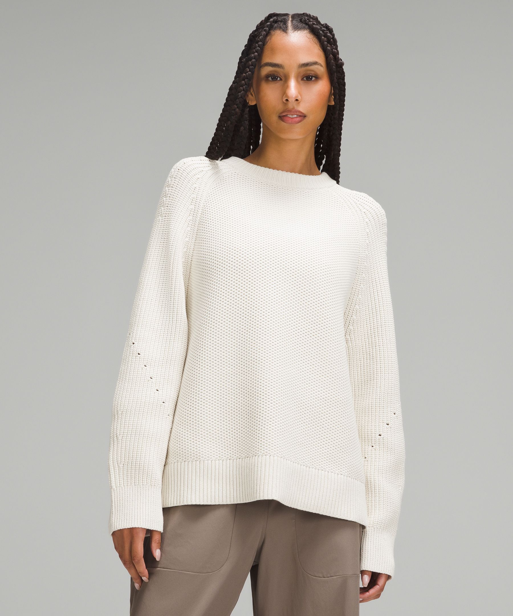 Fit Pics Texture Play Crew Sweater Light Ivory XS S. Anyone have experience with Cashlu material r lululemon Very well made.