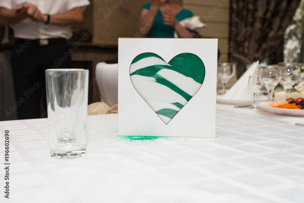 Sand ceremony vase in a wedding with colored sand being mixed together. Blending of the sands at wedding ceremony. White green heart made of sand in a glass vase. Stock Photo Very well made.