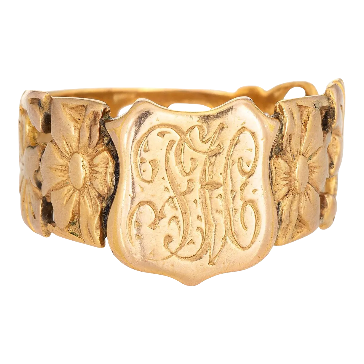 Antique Victorian Signet Ring 18k Yellow Gold Shield Monogram Flowers size 11 Very well made.