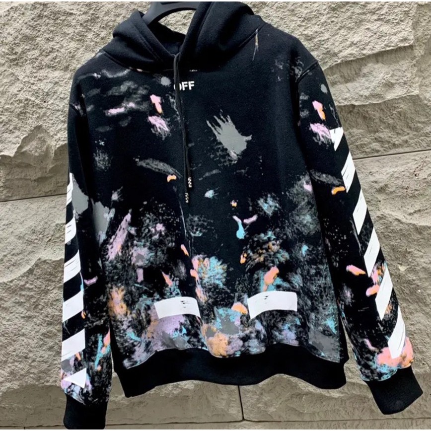 Off White Hoodie for Men and Women with Super Beautiful Lang Paint Flake Pattern Print Off White Hoodie with Extremely Sharp Back Logo Printed.LN Shopee Singapore Very well made.