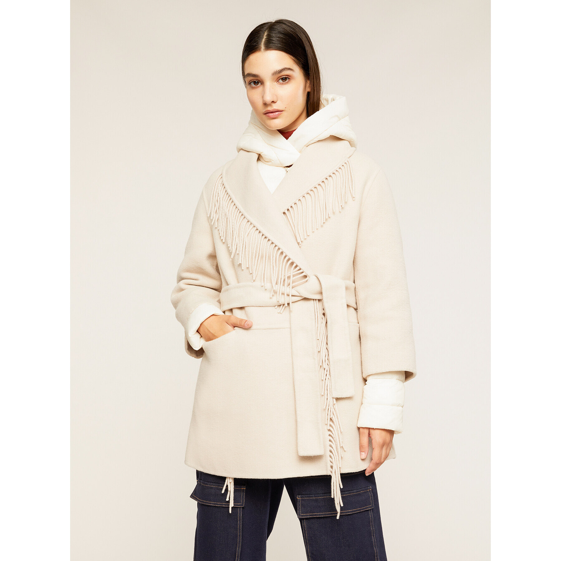Motivi Cappotto corto con frange e piumino interno Bianco Very well made.