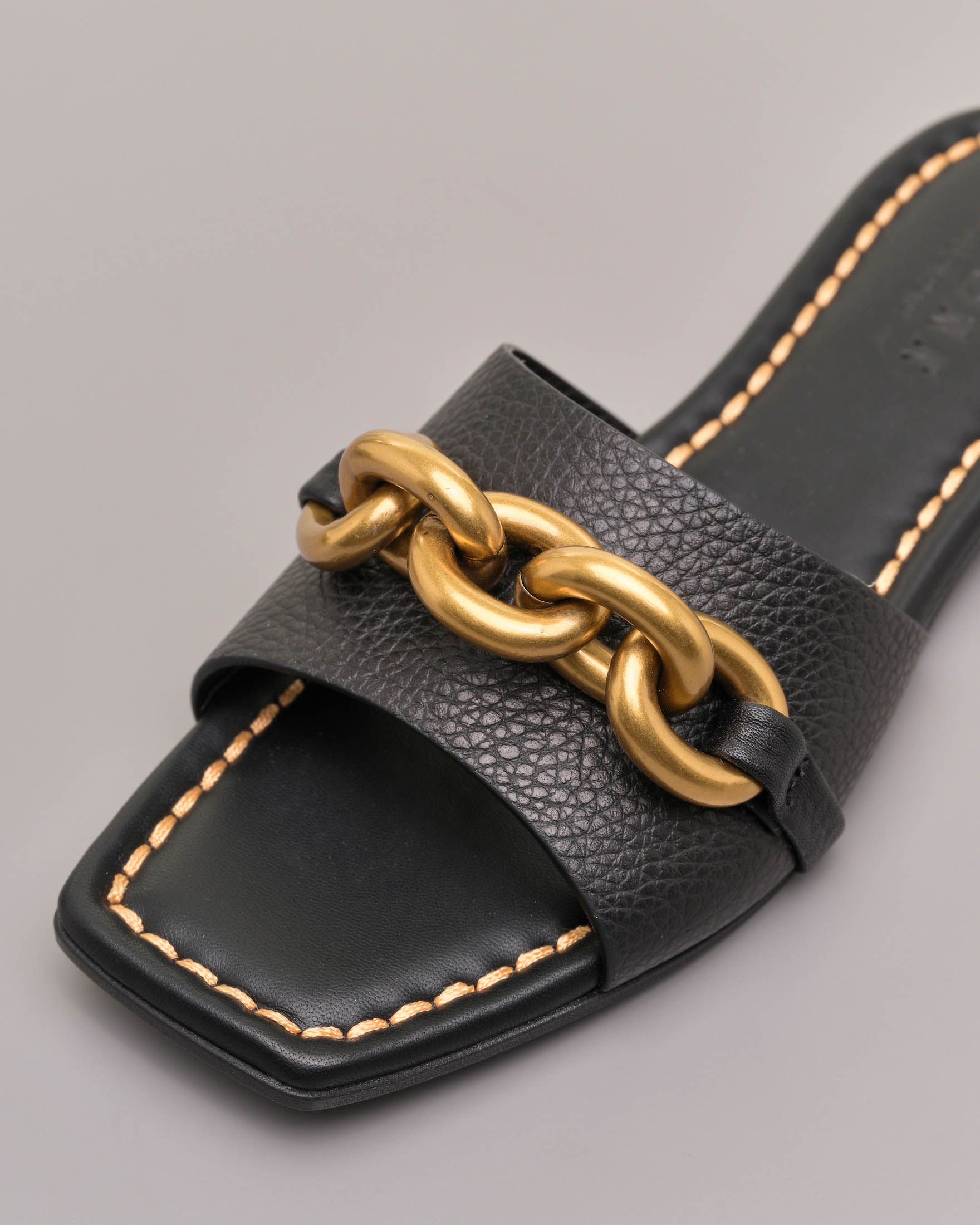 Sandali neri in pelle martellata con catena dorata applicata sulla fascia Very well made.