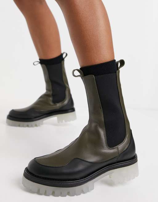 ASOS DESIGN Admire premium leather chunky Chelsea boots in khaki Very well made.