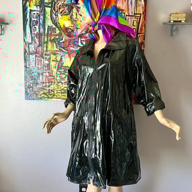 Shiny Raincoat Black Vinyl Zipper Front Swing Coat Vegan Vintage Gab About Vintage San Antonio TX Very well made.