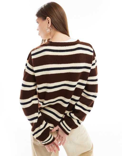 ASOS DESIGN fluffy knit v neck oversized cardigan in brown and blue stripe Very well made.