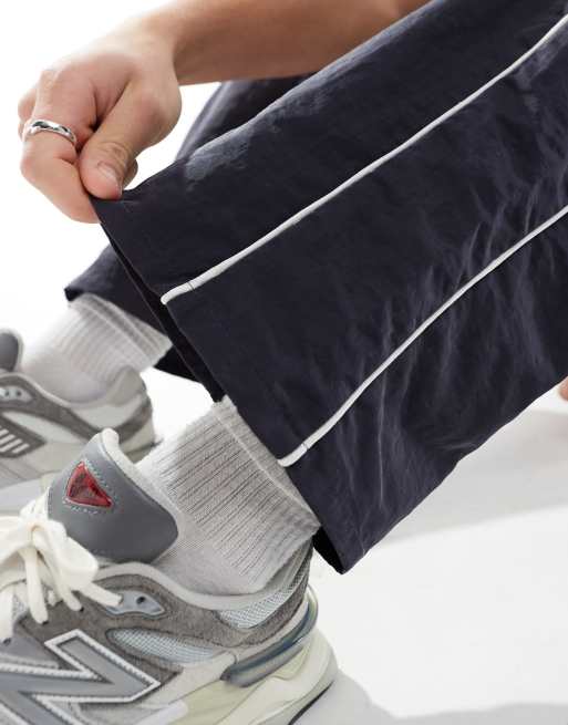 ASOS DESIGN baggy nylon track pants in navy with white piping Very well made.