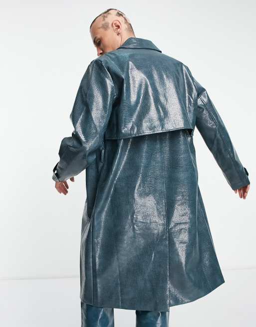 ASOS DESIGN faux leather crocodile print trench coat in teal ASOS Very well made.