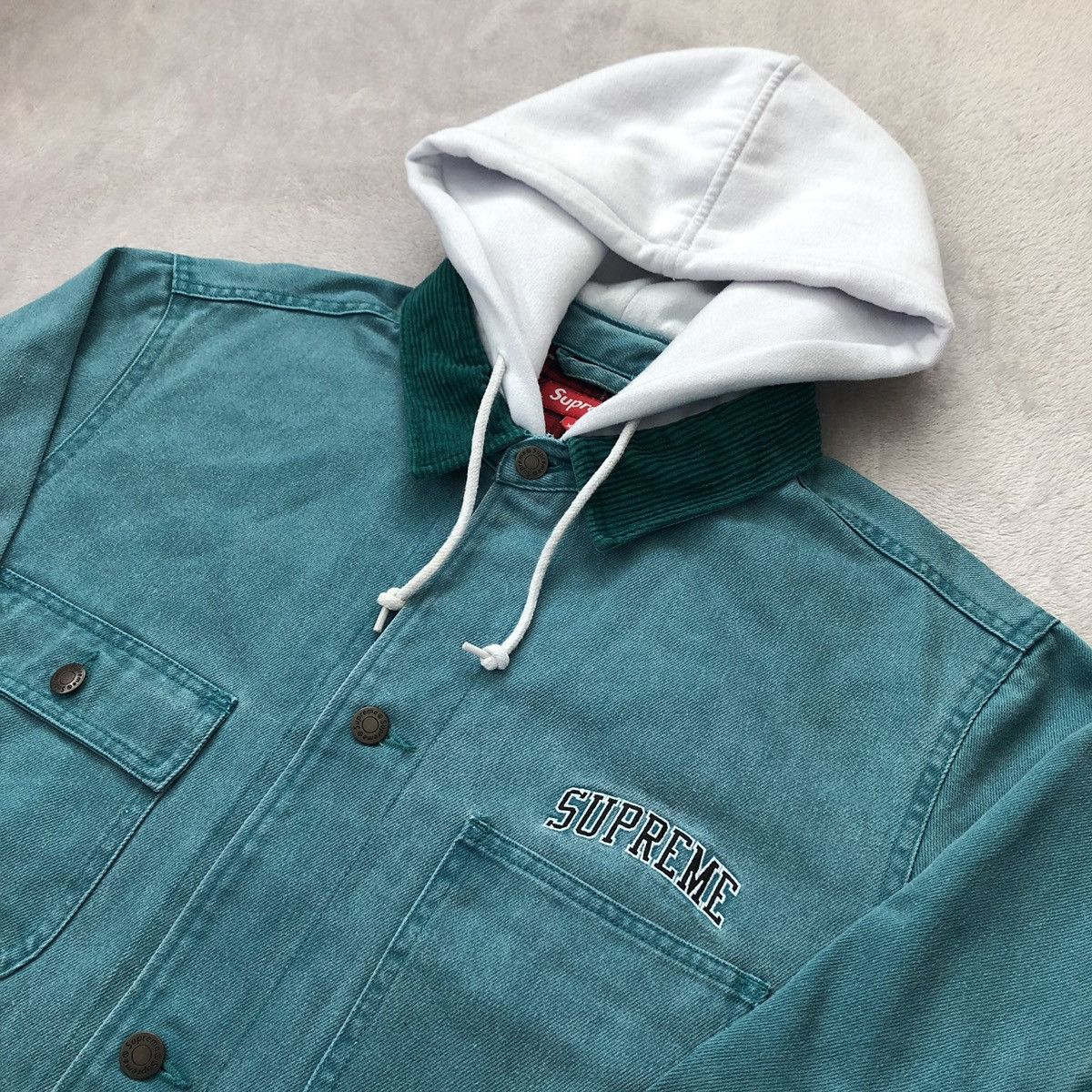 Supreme Supreme Hooded Denim Chore Jacket Teal White Hoodie Grailed Very well made.