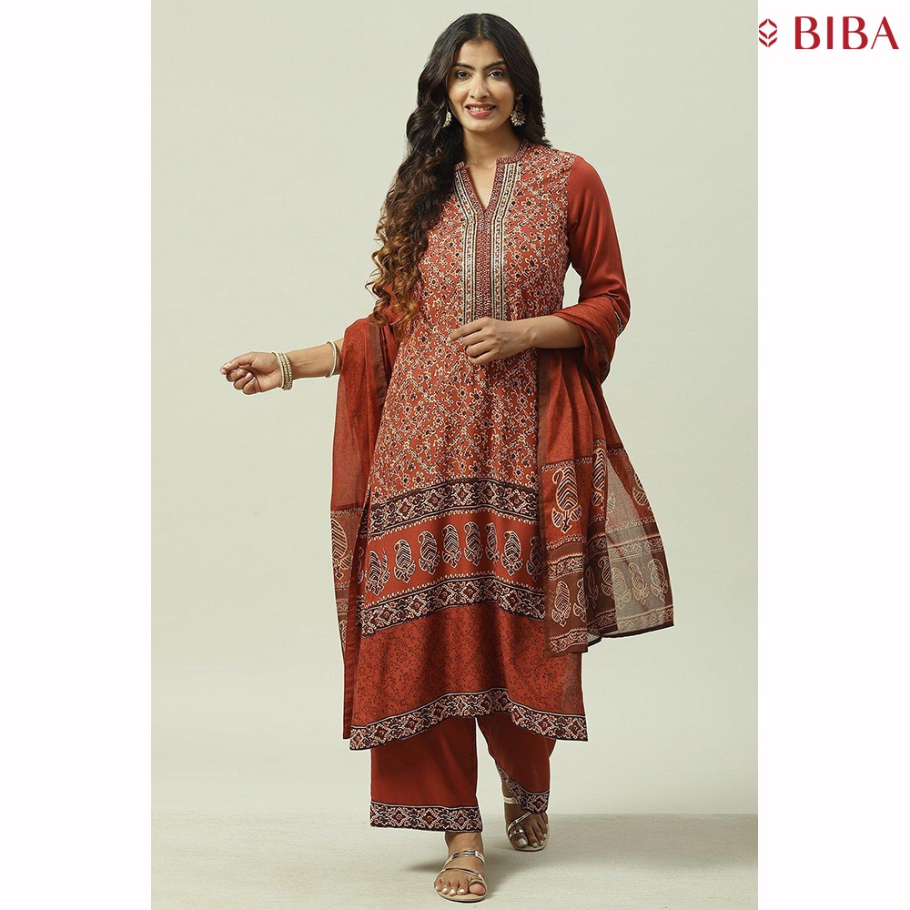 BIBA Ethnic Indian Wear Women s Rust LIVA Printed 3 4 Sleeve Kurta Palazzo Suit Set Shopee Malaysia Very well made.