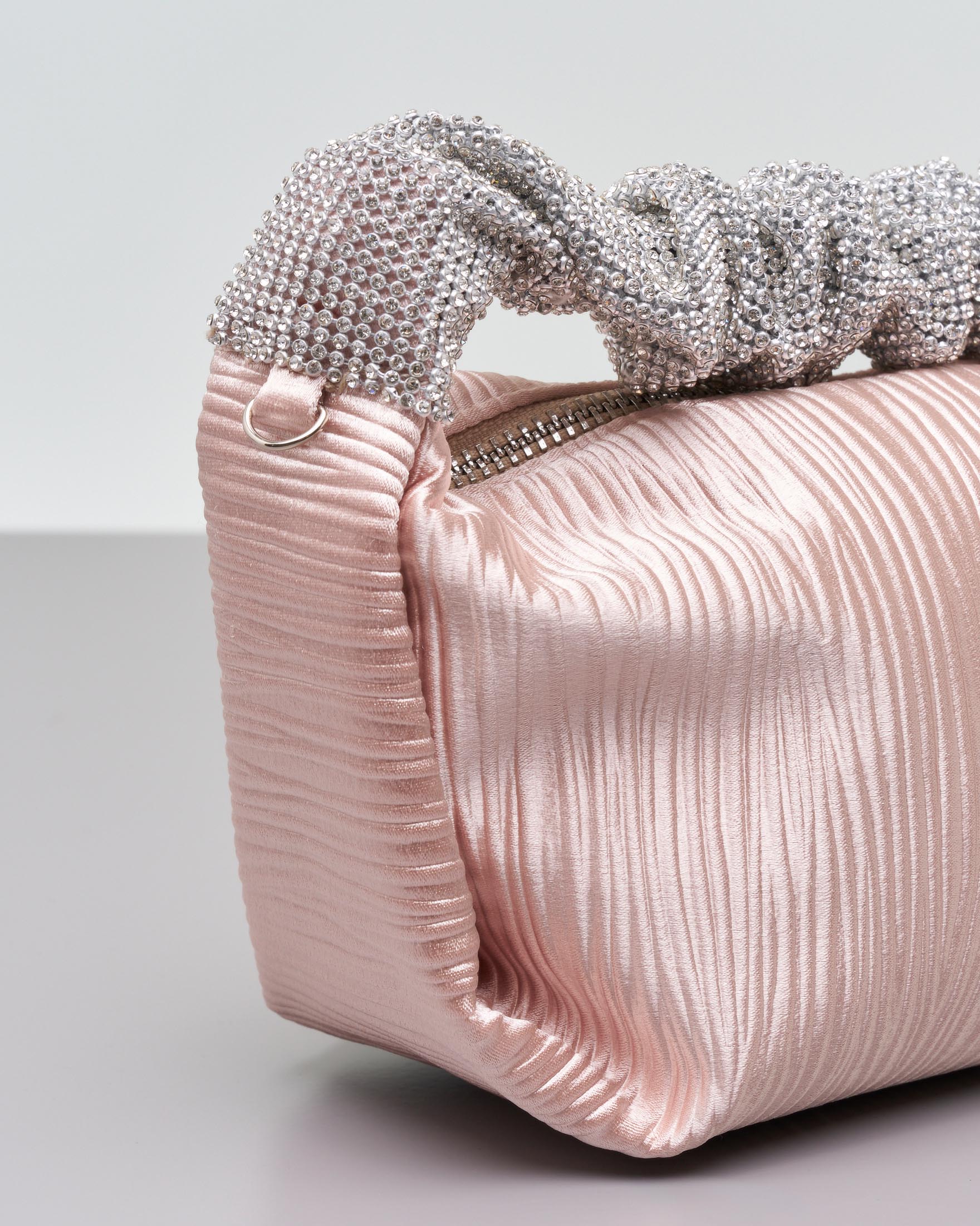 Borsa mini a mano rosa cipria in raso goffrato con manico rivestito in strass argento Very well made.