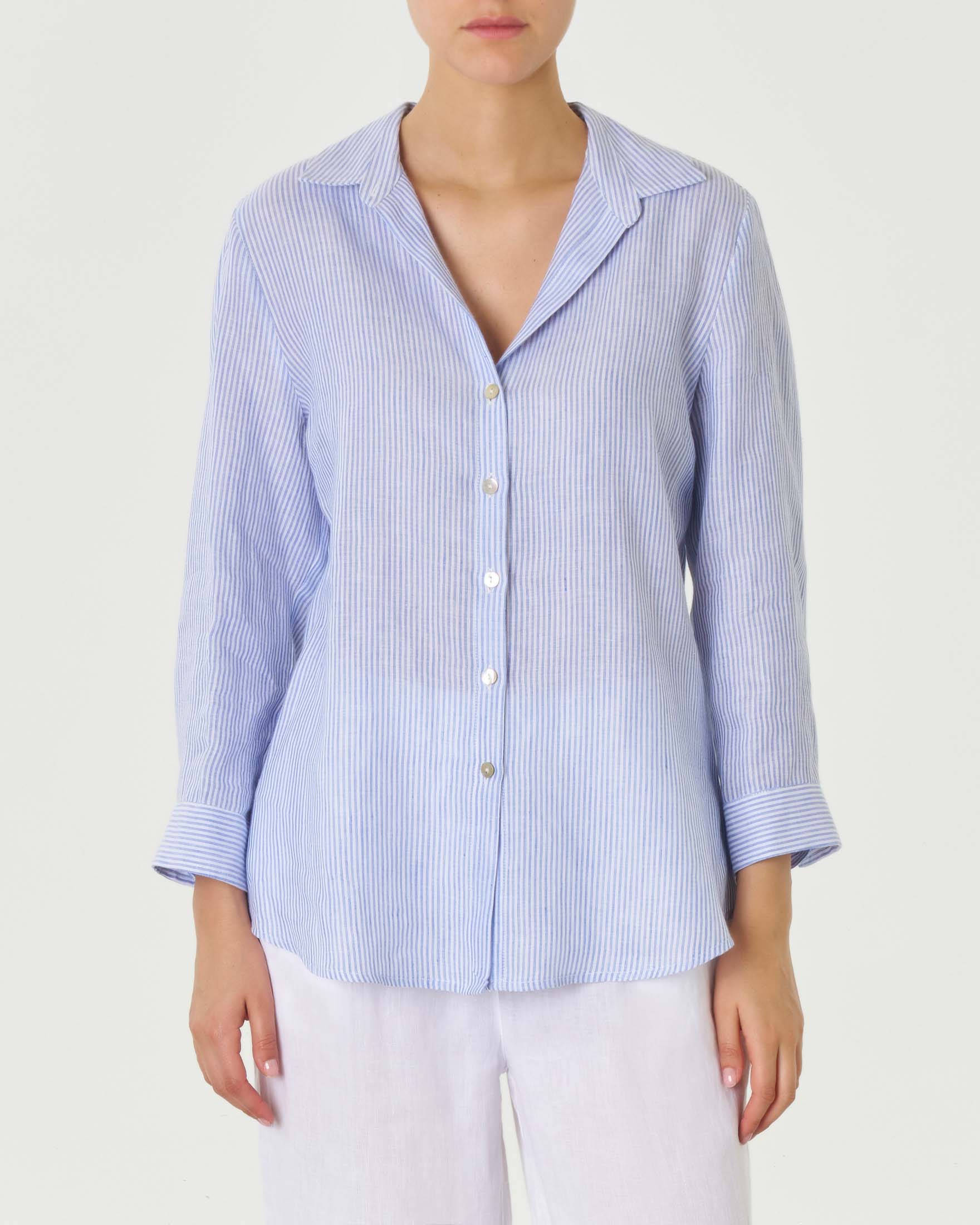 Camicia azzurro polvere in lino dalla linea sfiancata con colletto classico e apertura a V Very well made.