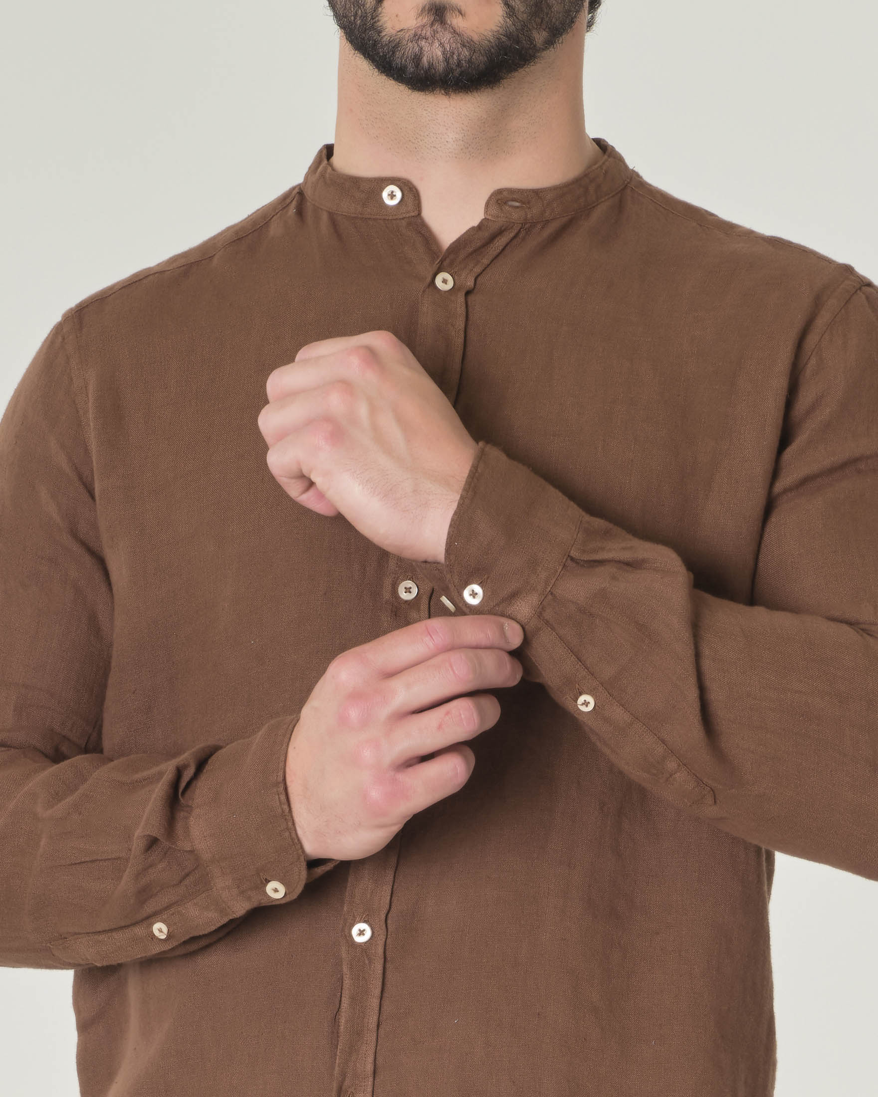 Camicia marrone in puro lino con collo a coreana Very well made.