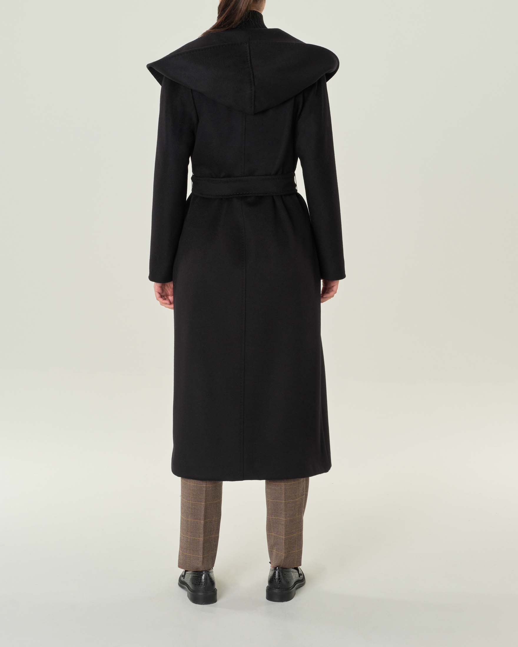 Cappotto nero in pura lana vergine con collo sciallato e cappuccio Very well made.