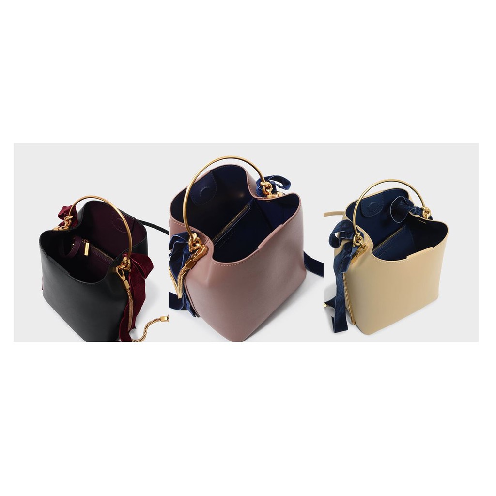 CHARLES KEITH Wearing all black Don t hold back on the frills. This bucket bag embellished with velvet ribbons is just what your outfit needs. Product featured Velvet bow detail bucket Very well made.