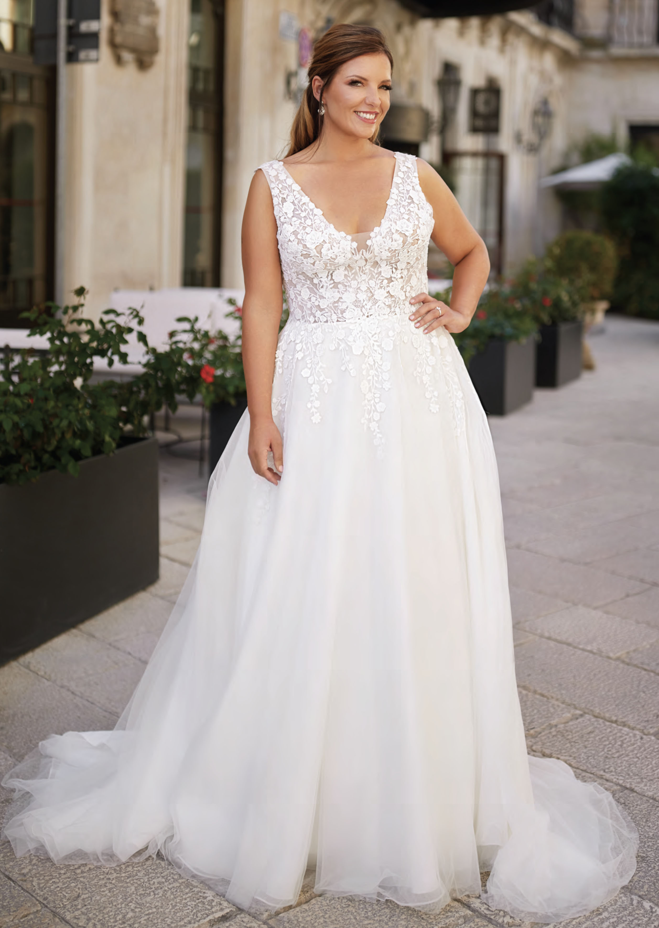 Abito da sposa bustier con corpetto trasparente steccato e con reggiseno interno con maniche corte fatto in raso e tulle con applicazioni di pizzo e perline Sposamore Very well made.