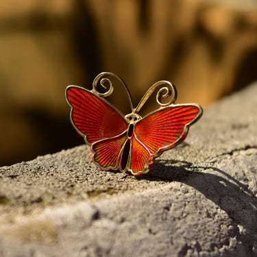 Vintage Enamel Butterfly Brooch Orange and Gold Metal Pin w Very well made.