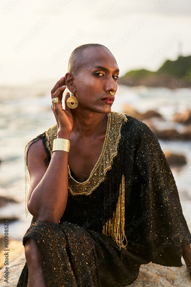 Androgynous ethnic fashion model in luxury dress jewelry sits on rocks by ocean. Gay black person in jewellery posh clothes poses gracefully in tropical seaside location. Pride LGBTQ bipoc concept. Ph... Very well made.