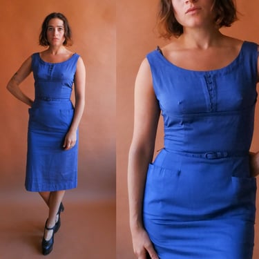 Vintage 50s Blue Wiggle Dress 1950s Fitted Dress with Belt Bottle of Bread Baltimore MD Very well made.