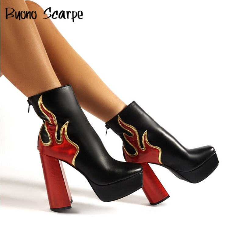 Black and Red Flame Style Chunky Heel Platform Boots FSJshoes Very well made.