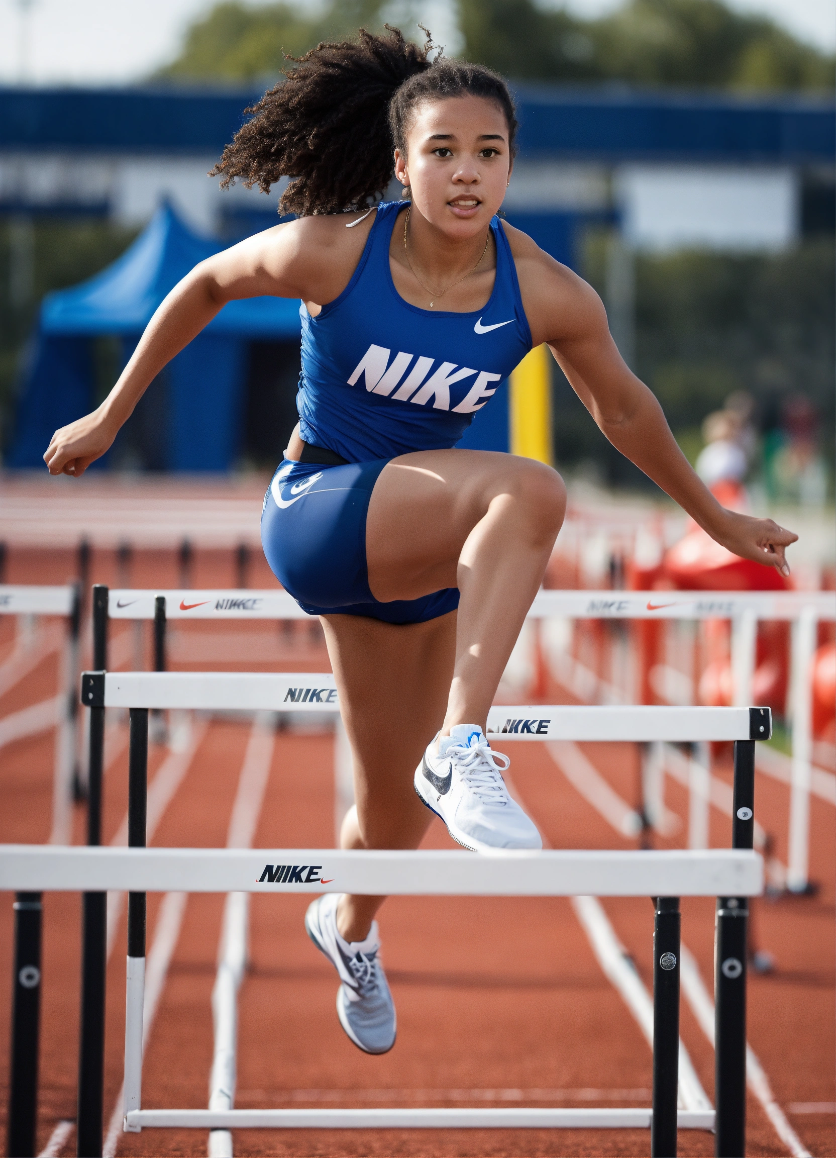 Lexica Biracial girl age 18 wearing a blue Nike track and field spandex shorts uniform. Jumping over hurdles Full body shot Very well made.