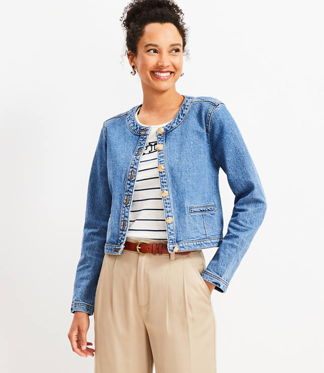 Collarless Denim Jacket in Bright Medium Stone Wash Very well made.