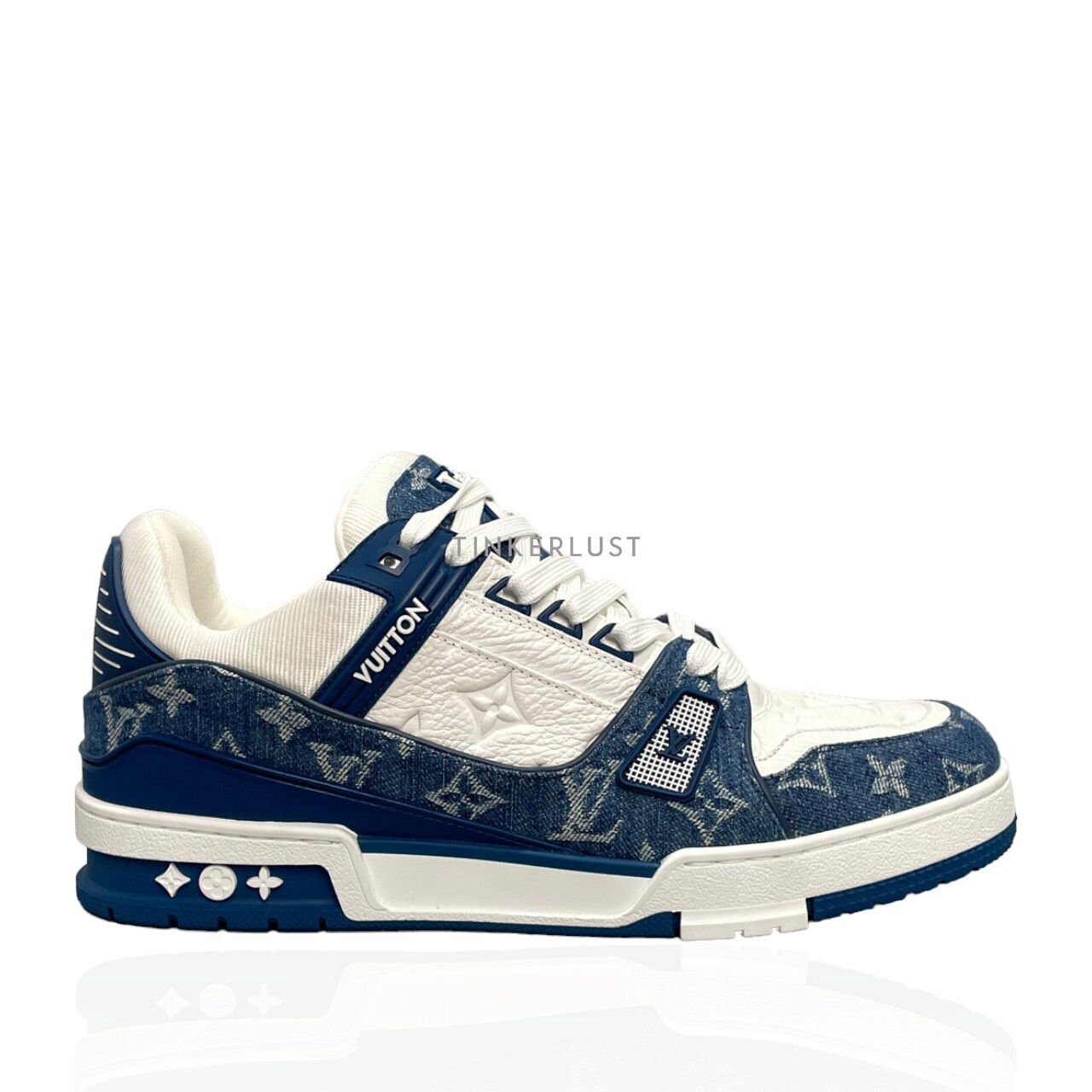 sepatu sneakers Louis Vuitton Trainer Low Top Leather Denim White Blue Sneakers Tinkerlust Very well made.