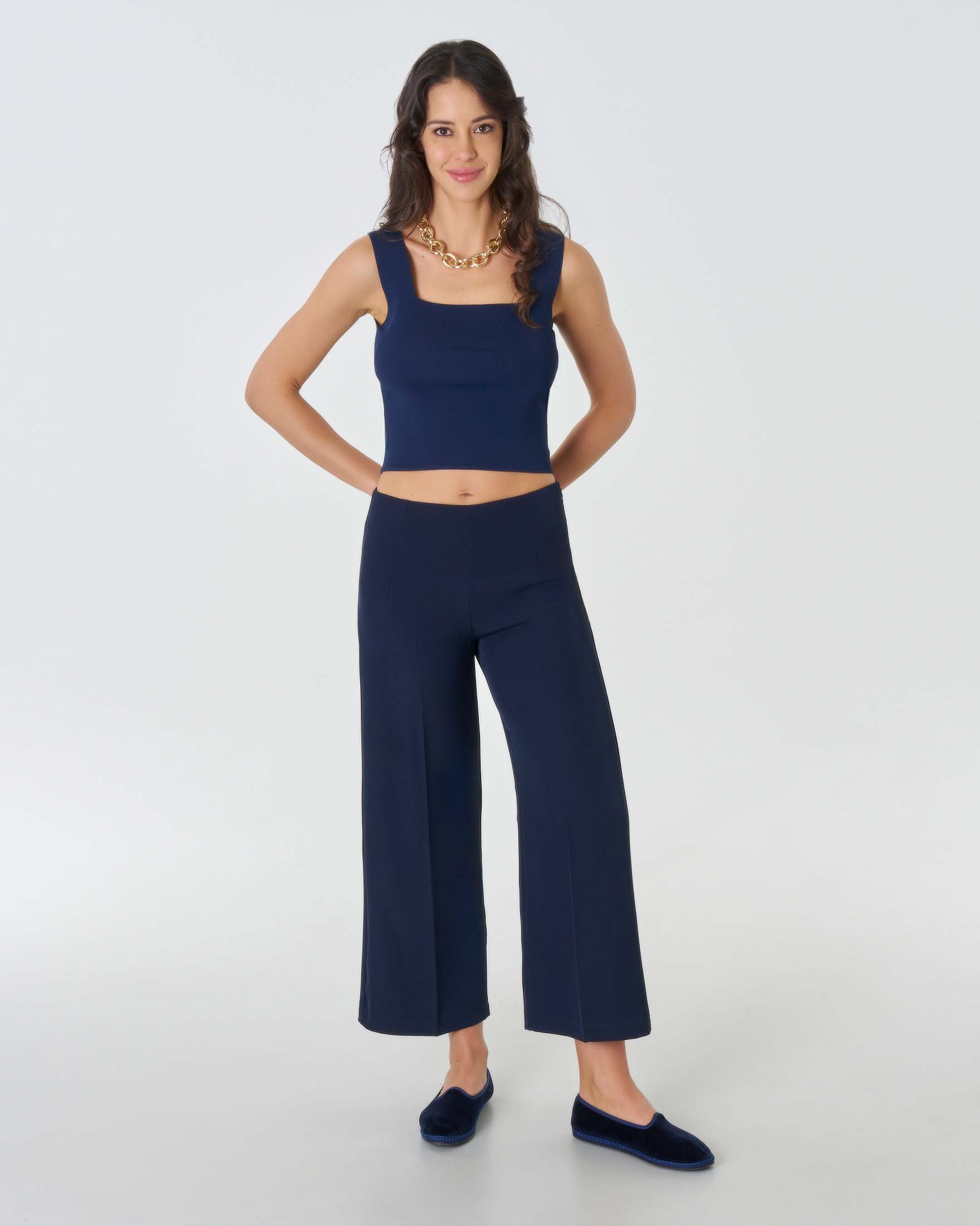 Pantaloni cropped blu a vita bassa in tessuto stretch fluido dalla linea ampia dritta Very well made.