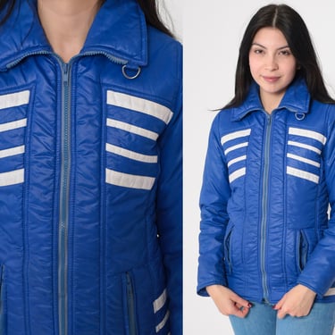 Powder Ridge 1980s Vintage Jacket 80s Powder Ridge Womens blues and white polyester filled ski jacket with zip front folding collar zipping waist pockets elastic waists and rib knit cuffs Very well made.