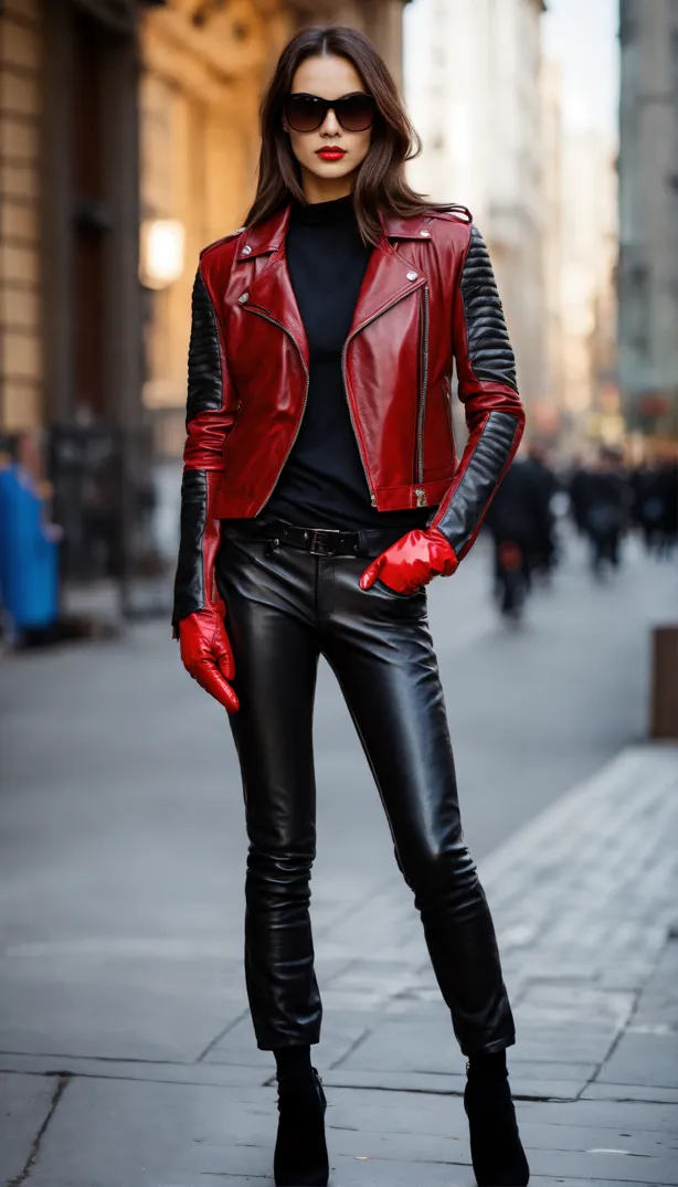 young trendy man with leather jacket red shirt and black pants with low waist. metropolitan background. Sun glasses in hand Stock Photo Adobe Stock Very well made.