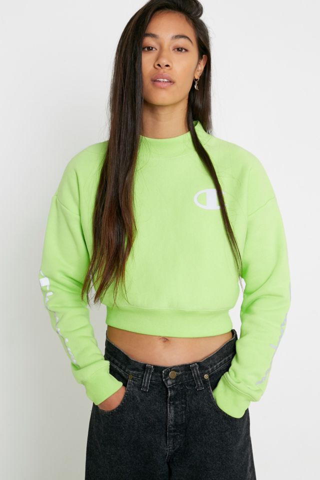 Champion UO Exclusive Green Reflective Logo Crop Crew Neck Sweatshirt Urban Outfitters UK Very well made.