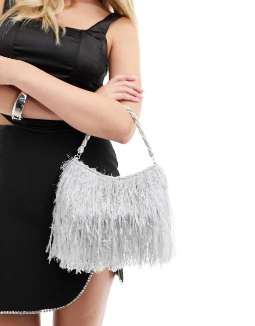 ASOS DESIGN diamante and pearl twist handle faux feather grab bag in grey ASOS Very well made.