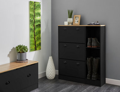 Shoe Storage Cabinet with Dropdown Drawers and Open Shelves in Black Very well made.