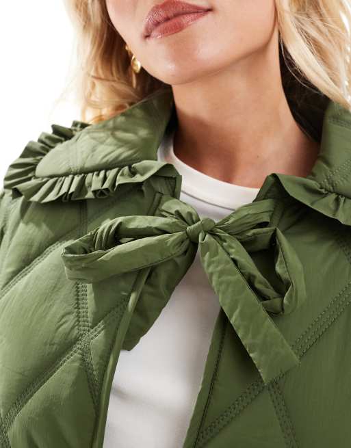 ASOS DESIGN Petite Veste matelassee avec col volante et liens noues a l avant Kaki Very well made.
