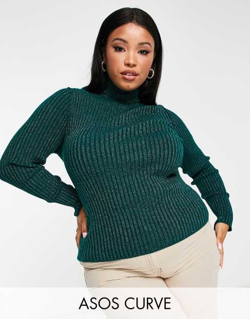 ASOS DESIGN Curve ribbed turtleneck sweater in dark green metallic yarn Very well made.
