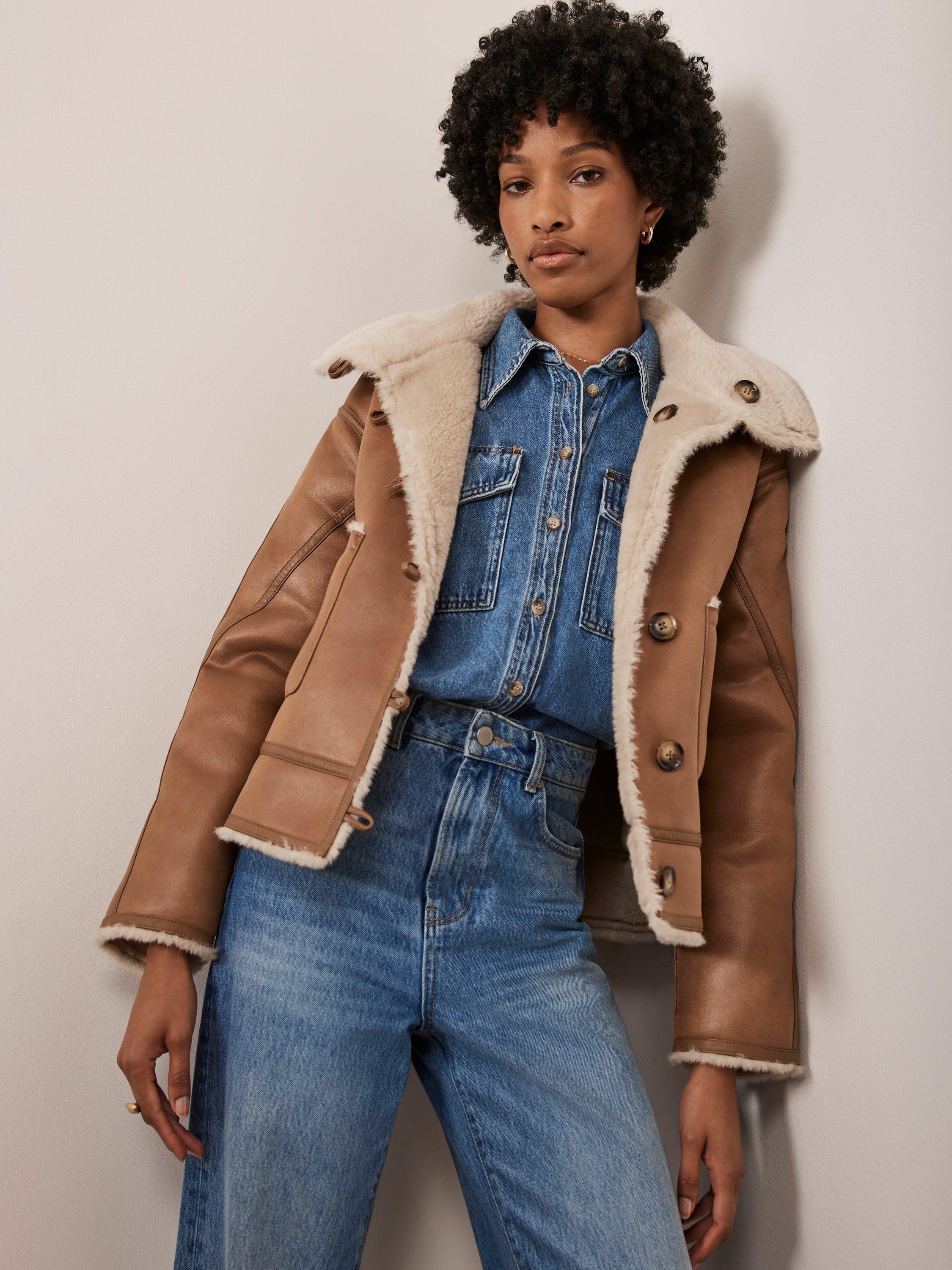 Mint Velvet Reversible Funnel Neck Borg Jacket Tan Ivory Very well made.